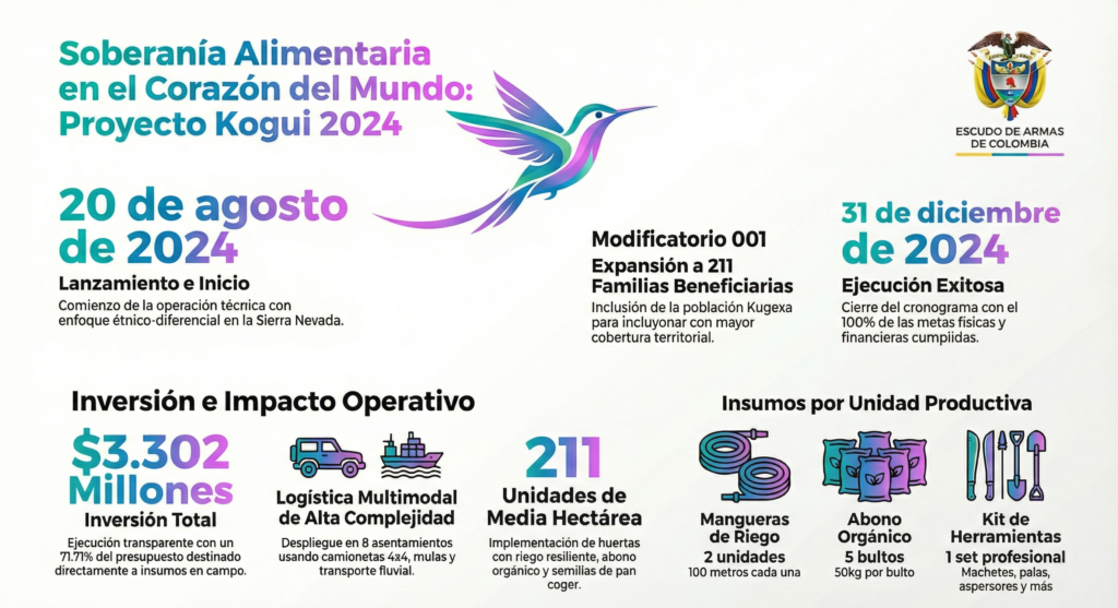 El proyecto “Fortalecimiento técnico y socio empresarial en la producción agrícola para la seguridad alimentaria de las comunidades Kogui en el Distrito de Santa Marta, CI009-2024” inició el 20 de agosto de 2024 y finalizó el 31 de diciembre de 2024. Su objetivo principal fue reducir la pérdida de la autonomía alimentaria del pueblo indígena Kogui, afectado por inseguridad nutricional y por un enfoque histórico asistencialista que no garantizaba sostenibilidad.