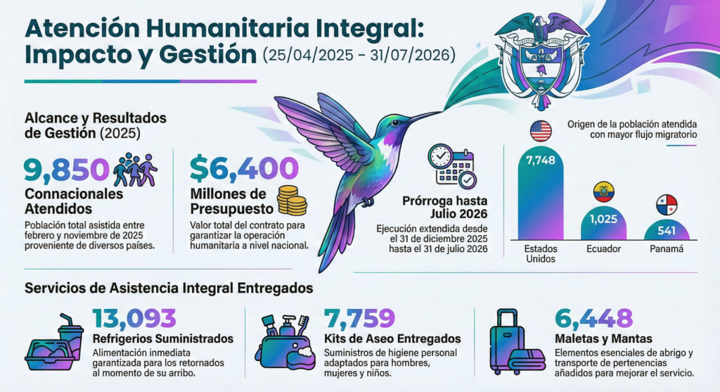 Iniciado el 25 de abril de 2025 y con una prórroga que va hasta el 31 de julio del 2026, el contrato responde a la necesidad de atender las condiciones básicas y de emergencia de quienes retornan en calidad de connacionales.